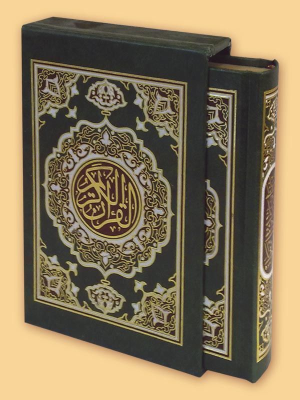 Mus'haf quart format (10x14) cm Quadrichromie, papier chamois, Reliure d'art, en relief, avec emboîtage poids: 420g